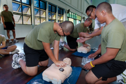 Recruits from Hawk Company learning the steps to CPR during Buddy Aid training at BMTC.