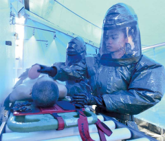 As part of their chemical defence training, medics must also learn to operate in a fast-paced environment while geared up in heavy Individual Protective Equipment or Mission-Oriented Protective Posture (MOPP) suits. The carbon-lined suits protect medics from CBRE contaminants.