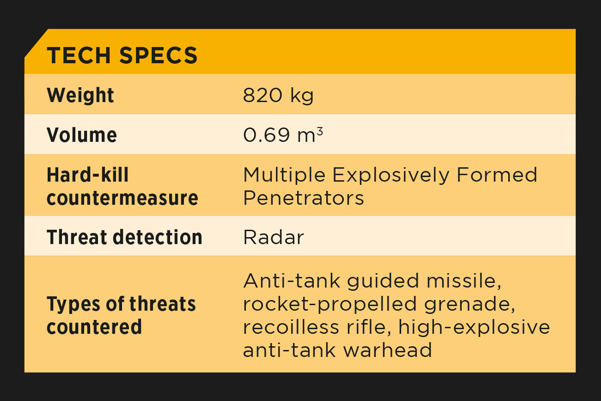 Known as the “Windbreaker”, Trophy APS is relatively lightweight, adding just 820kg to a 70-ton tank. This allows the tank to fend off an anti-tank guided missile without compromising its mobility. To defend against a similar threat using traditional armour, the tank would need to be fitted with many more tons of steel which would weigh down the vehicle and slow it down.