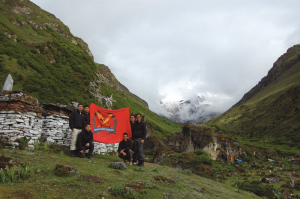 After three days of trekking, the crew made it to the highlight of their trip: the Jumolhari Base Camp (4,016m) at Jangothang, from where they had a great view of Mount Jumolhari (7,314m). To mark this achievement, the crew (standing, from left) Captain (CPT) Lin Hansheng, Lieutenant (LTA) Eddie Ong, Master Sergeant Ng Juin Shyang, CPT (Dr) Chiang Jian Bang and (squatting, from left) LTA Laurel Leong and LTA Ong Zhen An flew the OCS flag with pride.