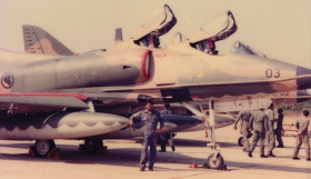 2WO (Ret) Kuppusamy with the now-retired A-4SU Super Skyhawks.