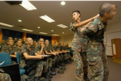 1SG Yuen demonstrating to trainees from the sea soldiers course how to handcuff an offender properly.