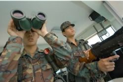 2SG (NS) Yeo Boon (left), who does security surveillance in CNB during his ICTs, is schooled in the rules of engagement which are used in the event of intruders.