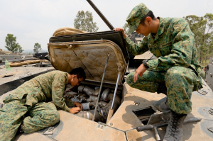 Corporal Lian Chuanyi, a vehicle mechanic checking that the Bionix II is in good working order as 2LT Leong looks on.