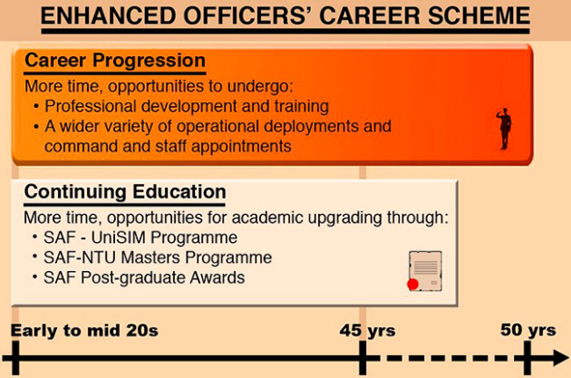 A key change in the officers' career scheme will be the extension of the retirement age from 45 to 50, which aims to give them more time to invest in developing and training -- for ground and joint postings -- and to maintain steady leadership renewal. This will also allow officers to acquire the necessary knowledge and expertise to operate new capabilities and to function effectively in the 3rd Generation SAF.