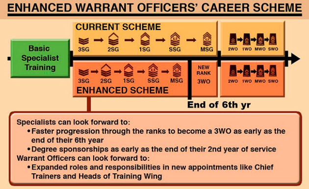 The enhanced warrant officers' career scheme will give them more responsibilities and feature a new 3rd Warrant Officer rank. The former maximises their potential while the latter allows those who perform well to become warrant officers as early as at the end of their sixth year.