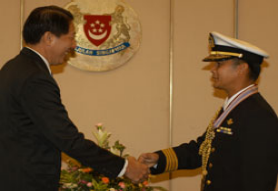 Commander of the Royal Brunei Navy, Yang Mulia Colonel (COL) Joharie bin Haji Matussin, was presented with Singapore's prestigious military award, the Meritorious Service Medal (Military), by Minister for Defence Teo Chee Hean at the Ministry of Defence on 26 Aug.