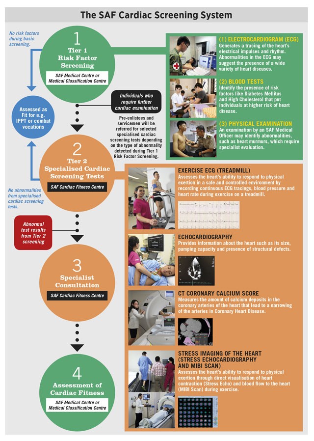 As part of their cardiac screening process, all national servicemen and pre-enlistees first undergo Tier 1 cardiac risk factor screening at an SAF Medical Centre or Medical Classification Centre respectively.
