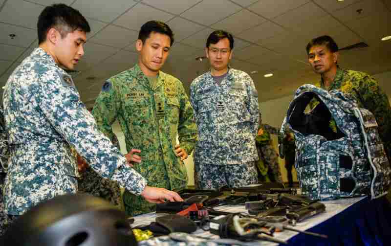 ASSeT member 2nd Lieutenant (2LT) Kenneth Yang had briefed MG Lim earlier on the typical equipment they wear when performing ship-boarding operations, such as the 12-kg Flotation Body Armour vest and the MP5 gun.
