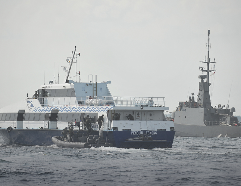 For a brief moment, it is pure pandemonium. On the water, large grey silhouettes appear over the horizon, bringing help to restore order. Their markings make it clear that these are the good guys. From the Singapore Armed Forces come Patrol Vessels from the Republic of Singapore Navy; fast craft piloted by the Special Operations Task Force (SOTF), and a helicopter with more members of the SOTF.