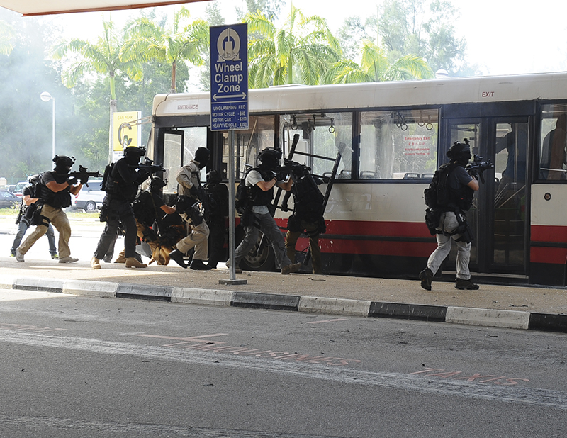 Personnel from the multiple agencies neutralising terrorist attacks at Tanah Merah Ferry Terminal.