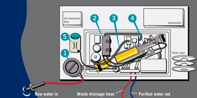 The hoses are colour-coded: Red hoses are for raw water while the blue hose is used to deliver clean water. Accessories such as the flotation ring are stored in a metal box bolted onto the platform.