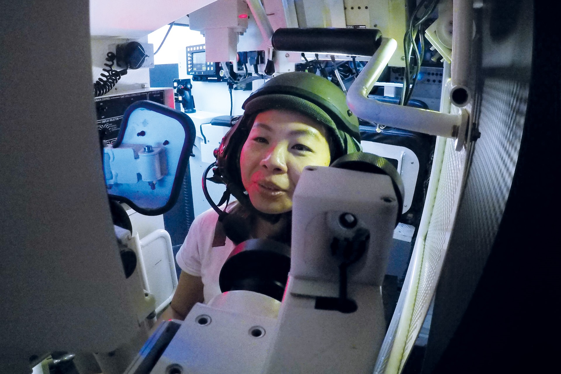 Bercakap dengan saya melalui alat komunikasi di dalam topi keledar, Leftenan Teng mengajar saya asas kemahiran pemanduan kereta kebal. Apabila kereta kebal berderam derum sambil bergerak dengan perlahan, saya dapat melihat "kenderaan" yang lain dan "pokok" yang saya lalui menerusi tiga periskop yang terdapat di dalam kereta kebal.