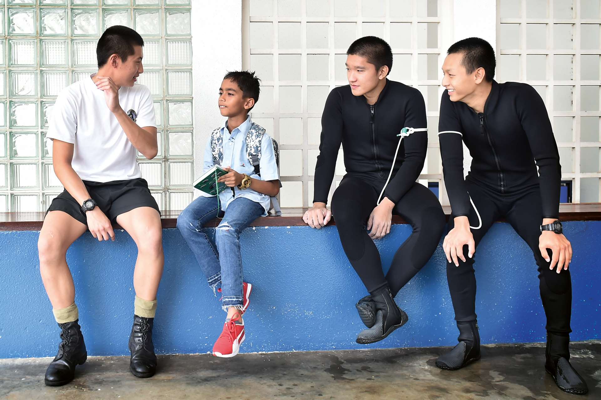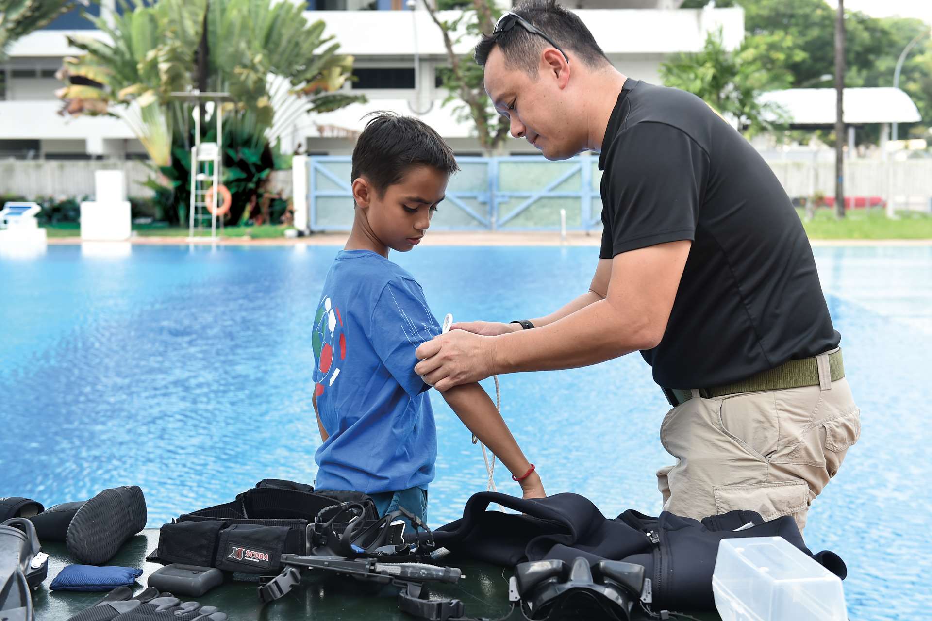 Nine-year-old Sunay Mishra gets a taste of naval diving training from his "buddy" 2nd Warrant Officer (2WO) Andrew Chng, a frogman school instructor.