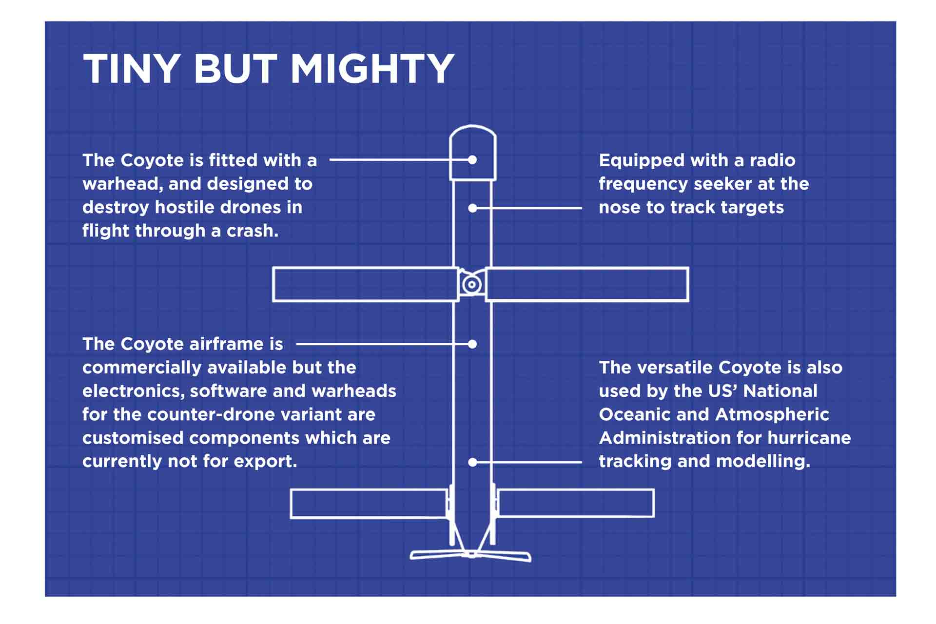 The US Army has already used the Coyote for intelligence, surveillance and reconnaissance operations. The new variant, known as block 1B, is equipped with advanced sensors and warheads for counter-drone missions.