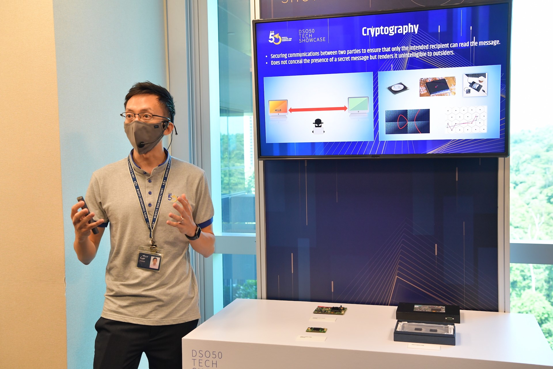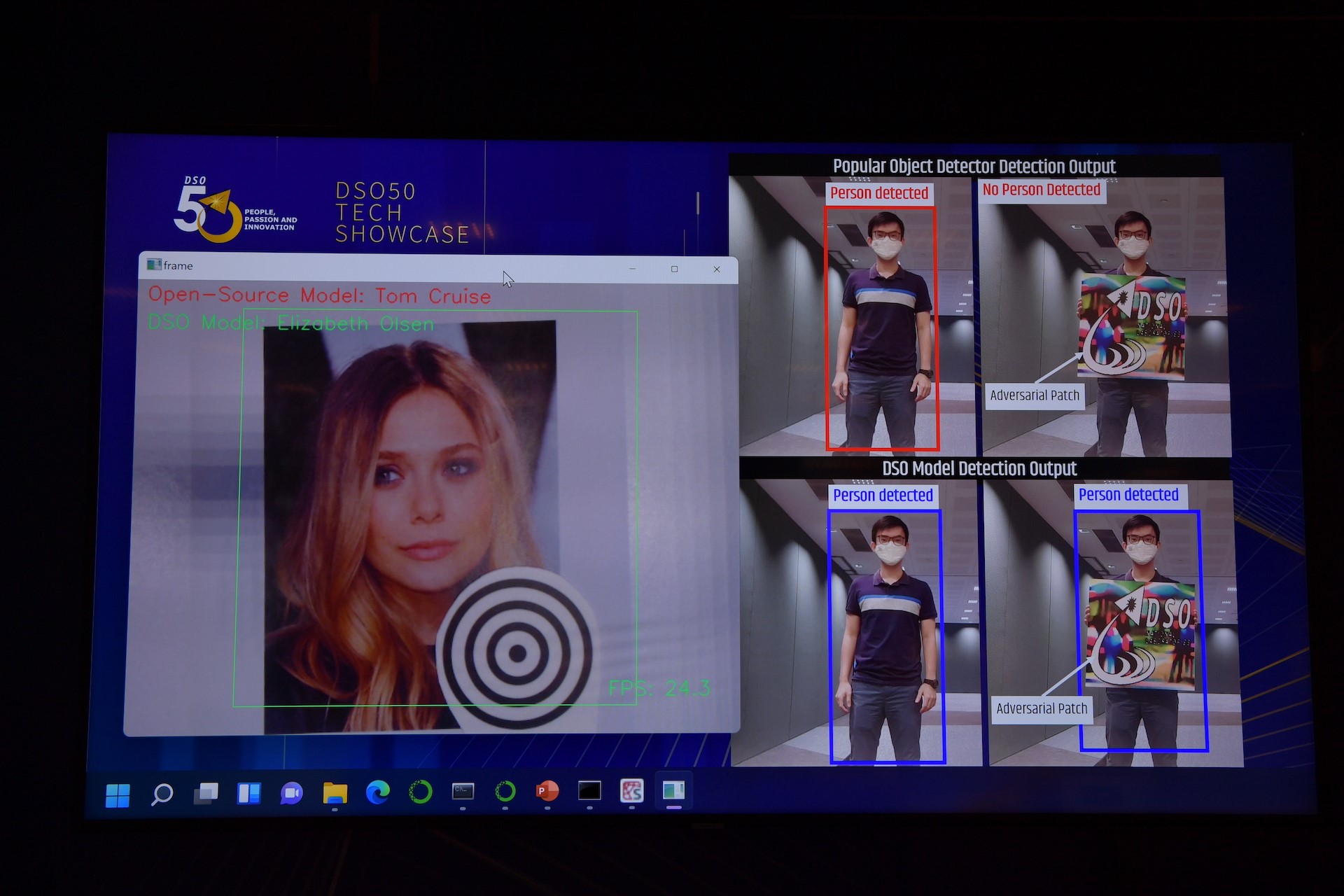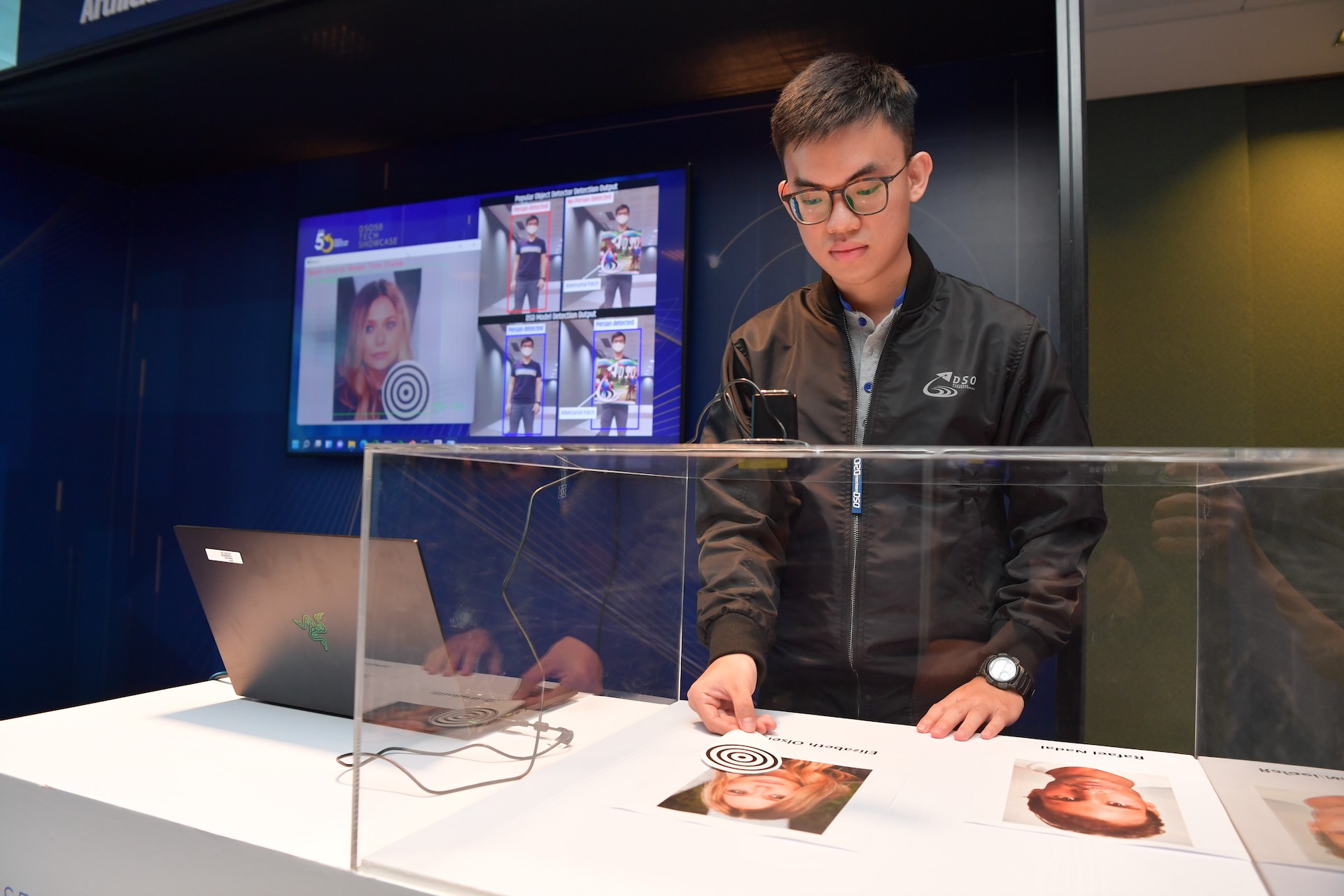 Salah satu projek yang dipaparkan di Pameran Teknologi DSO50 ialah sistem yang membantu mempertahankan diri daripada penipuan berniat jahat. Penipuan sedemikian boleh berlaku apabila musuh menambah corak tertentu pada objek, yang menjadi "bunyi" yang boleh mengganggu pengecaman imej AI.