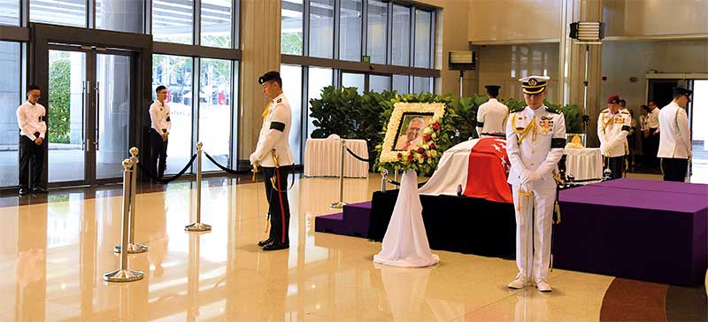 Vigil guards from the SAF and Singapore Police Force, led by a senior officer, stood in formation to guard his casket as his body lay in state at Parliament House on 25 Aug. The state flag on all government buildings was also flown at half-mast from 23 to 26 Aug.