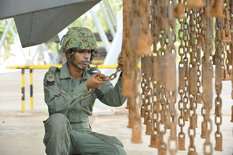 "Each head strikes the ground with 1.7 tonnes of force. That (force) is more than what typical mines can withstand. When the striker heads hit, the mines are completely destroyed, detonated or simply thrown out of the path," explained 3SG Logavel Balakrishnan, MEC, 38 SCE.