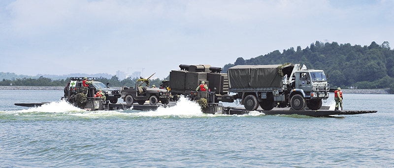 In the dead of night on a riverbank somewhere in western Singapore, a group of soldiers are hard at work. They stand on a floating metal platform, roughly the size of a tennis court, which straddles the water and the bank. Troops and vehicles load up onto the platform and the two pilots rev up the engines to turn the platform around. Slowly, the entire platform, with its load, makes its way across the river.