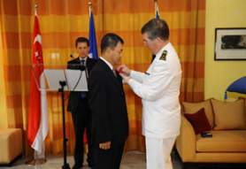 Former Chief of Navy Richard Lim was conferred the medal of Officer in the Order of Legion d'Honneur (Legion of Honour) by Inspector-General of the French Armed Forces for Armament, Ingenieur General de Classe Exceptionnelle de l'Armement (IGCEA) Jean-Paul Panie on 19 Mar at the Residence of the French Ambassador to Singapore.