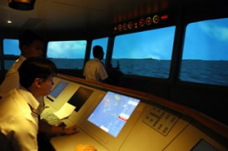 The simulator has a 270-degree visual system displaying all terrain and models digitised from actual video footage. Instructors can choose the type of vessel and the area of operations to work on. Trainees can practise berthing and unberthing, anchoring or coming alongside another vessel that is underway or at anchor.