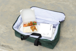 The improvised meal box features a "cover-over-base" cover, which has flaps at two corners of the cover that "lock" the meal box when closed. This ensures that the food is kept warm and safe for consumption for up to four hours when the meal boxes are packed into the green insulated carriers and transported outfield.