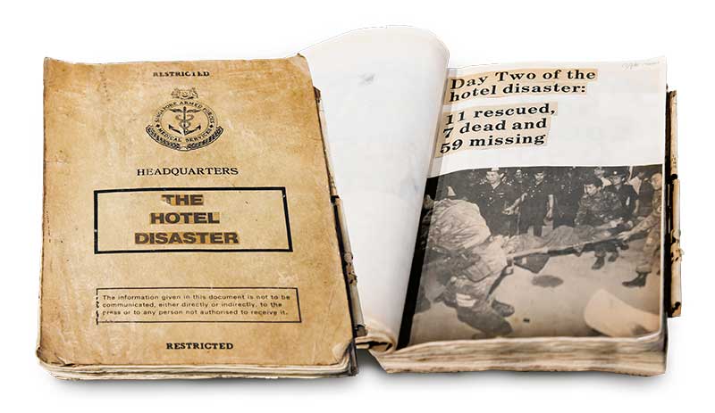 This operations scrapbook, donated by the SAF Medical Corps, details the events of the Hotel New World Collapse through news clippings. The 1986 disaster, which took 33 lives, is Singapore's worst civil disaster. The ensuing five-day rescue effort involved 500 personnel from the SAF, Singapore Civil Defence Force, the former Singapore Fire Service and the Singapore Police Force.