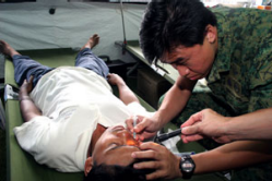 "Over at Koto Bangko, the polyclinic was badly damaged by the earthquake, and many villagers did not have transport to town hospitals. So instead of having them come to us, we brought direct medical aid to them and performed minor procedures such as wound dressing," explained Captain (Dr) Hope Ang, the Navy Medical Services Medical Officer who manned the mobile clinic.