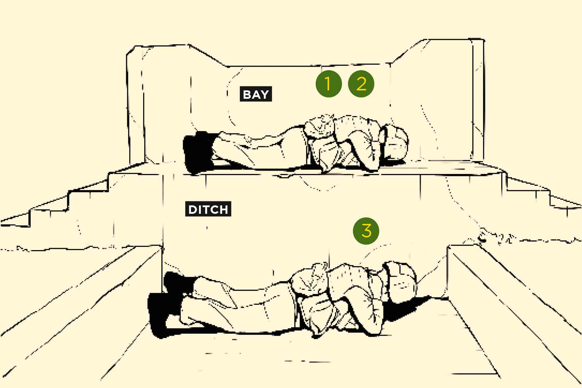 The grenade drops and lands just a few feet outside the bay. The recruit lies flat on the ground, flushed against the wall of the bay. He keeps count while listening out for the explosion. In the actual scenarios, the safety officer will lie on top of the recruit to shield him.