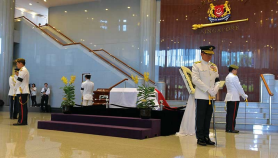 Vigil guards, comprising Singapore Armed Forces (SAF) officers, solemnly stood in formation to guard Mr Lee's casket as his body lay in state at the Parliament House from 25 to 28 Mar.