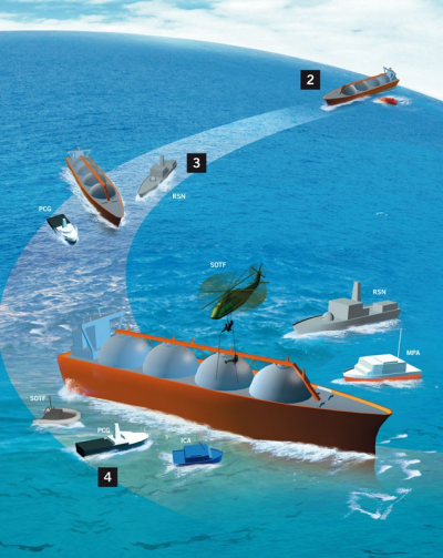 Scanning the maritime environment for the terrorists' possible modes of attacks, the NMSC detects an anomaly: a tanker heading towards Singapore waters which does not transmit its identification signals. A check with MPA and the vessel's shipping agent also indicates that the tanker is not responding to calls. The NMSC assesses that the tanker may be used as a "floating bomb" and activates NMOG to coordinate a multi-agency response to counter the threat. As part of the response plan, RSN and PCG vessels are deployed to intercept and escort the tanker.