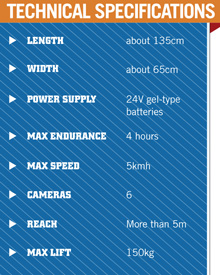 When the boom of its telescopic arm is fully retracted, it can carry loads of up to 150kg, or the equivalent of two average men. Even when the boom is extended to its near-maximum length at 5.2m, it can still lift up to 5kg. The Wheelbarrow Mk 9 has a maximum reach of more than 6m.