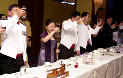 Then, 'Mr Vice', who is usually the youngest officer in the dining-in, proposes a toast to the President by saying: "Ladies and gentlemen, please rise. May I now propose a toast to the President of the Republic of Singapore."