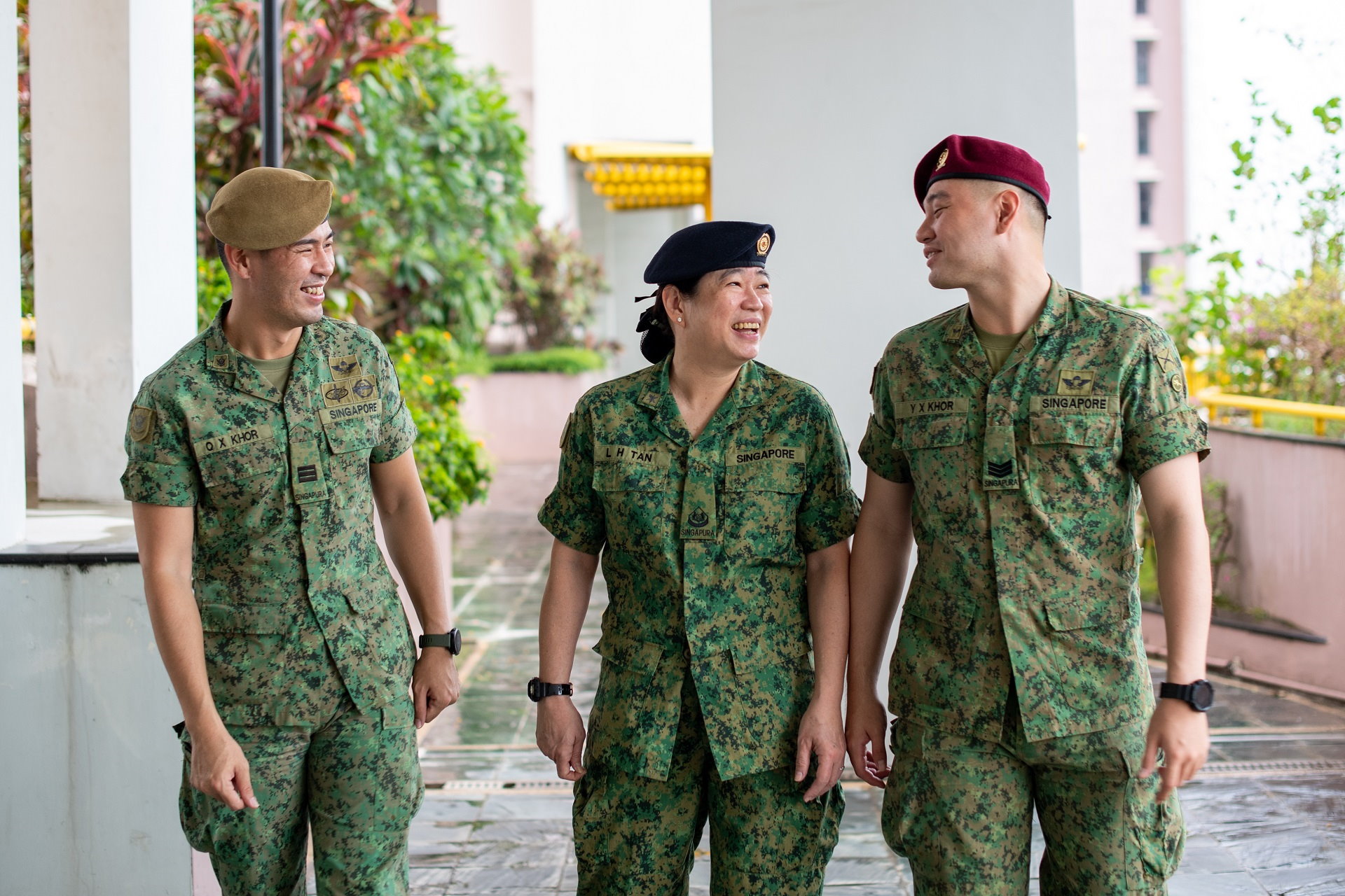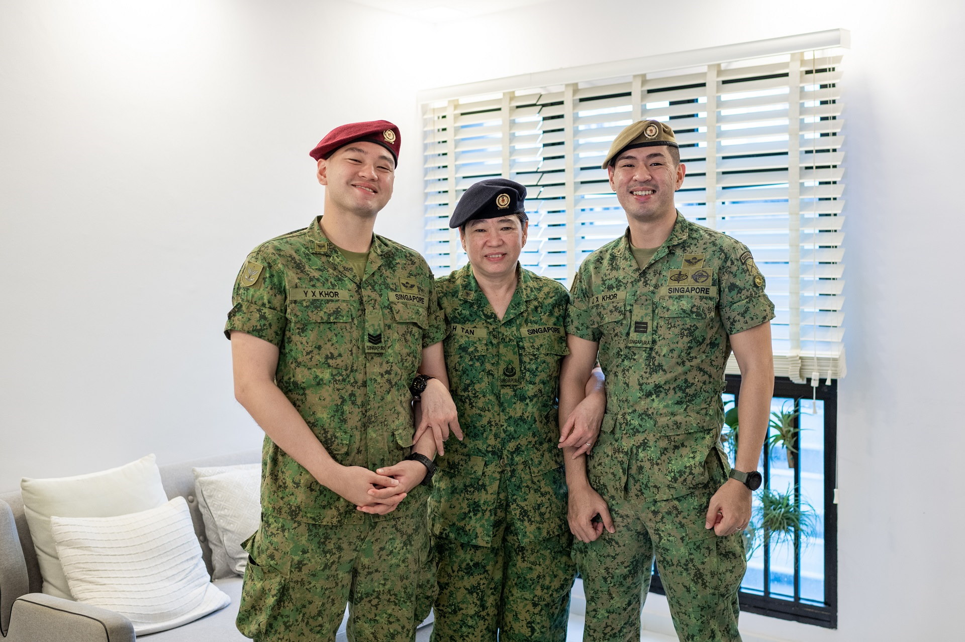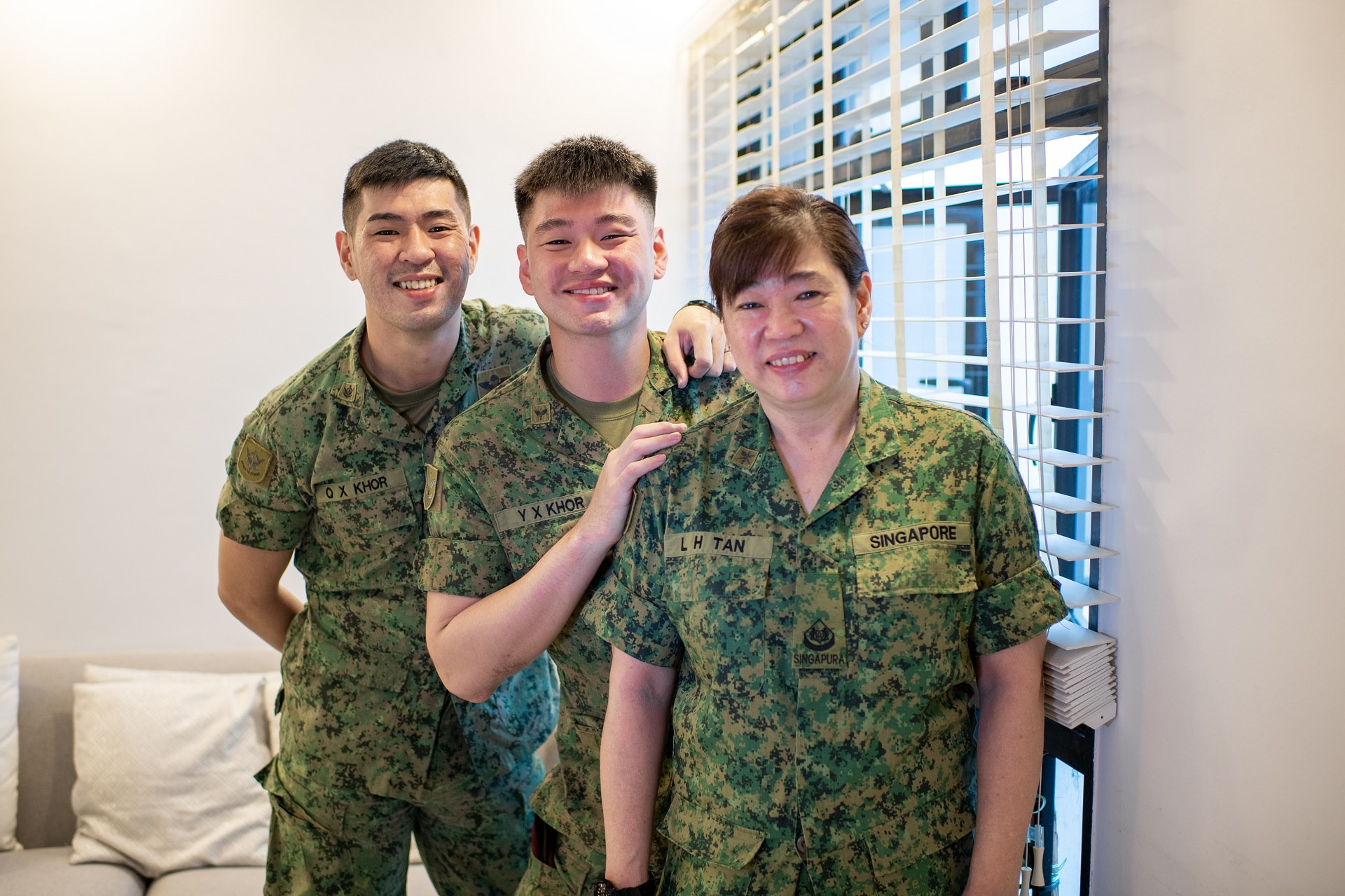 Sejuk lagi mata memandang: dua anak lelaki sedang bersibuk-sibuk dengan ibu mereka sebelum sesi foto. Anak lelaki yang lebih tua Kapten (KPT) Khor Qi Xiong sedang membetulkan beret Pegawai Waran ke-3 (3WO) Alice Tan, manakala anak lelaki yang lebih muda Sarjan ke-3 (SG) Sean Khor sedang meluruskan pakaian seragamnya.