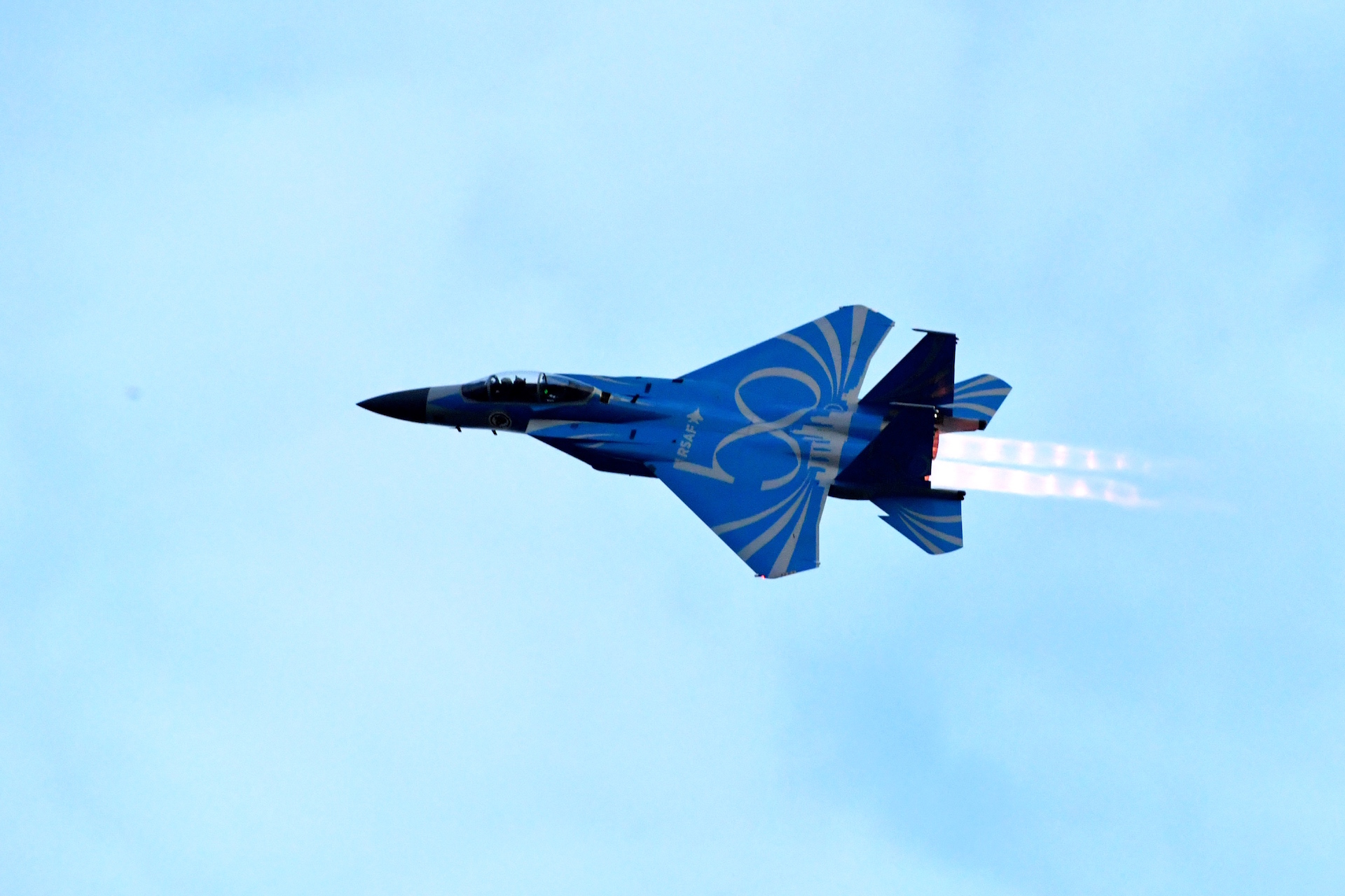 Additionally, an F-15SG sporting the special blue RSAF50 livery will perform a series of high-speed manoeuvres before powering through a vertical climb to 8,000 feet (about 2.5 kilometres).