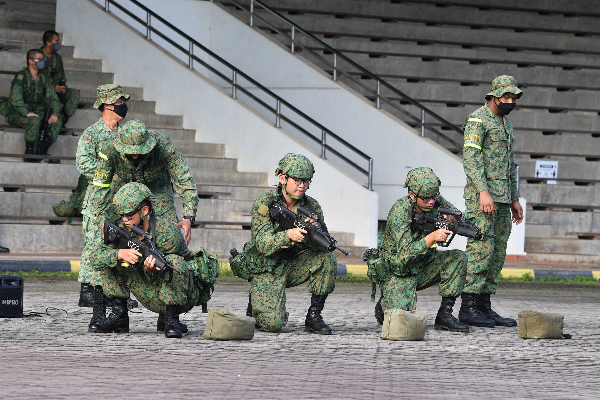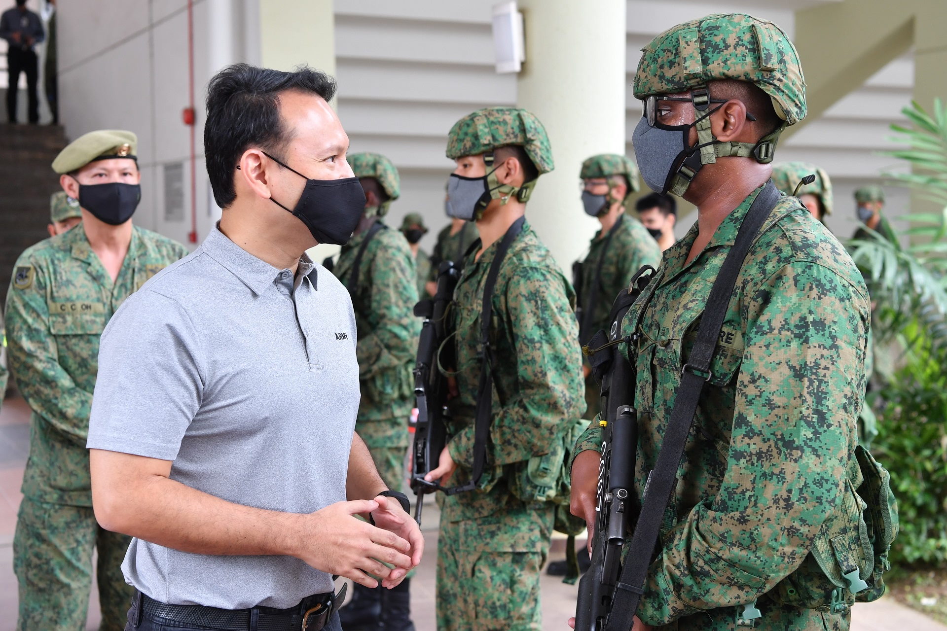 Selain daripada memerhati para rekrut menjalani latihan pengendalian teknikal bagi Raifal Tempur Singapura - kurun ke-21 (SAR 21), Encik Zaqy juga menyaksikan upacara mengangkat sumpah dengan langkah-langkah pengurusan selamat yang telah ditetapkan, sebagai sebahagian daripada proses penyertaan yang diubah suai.