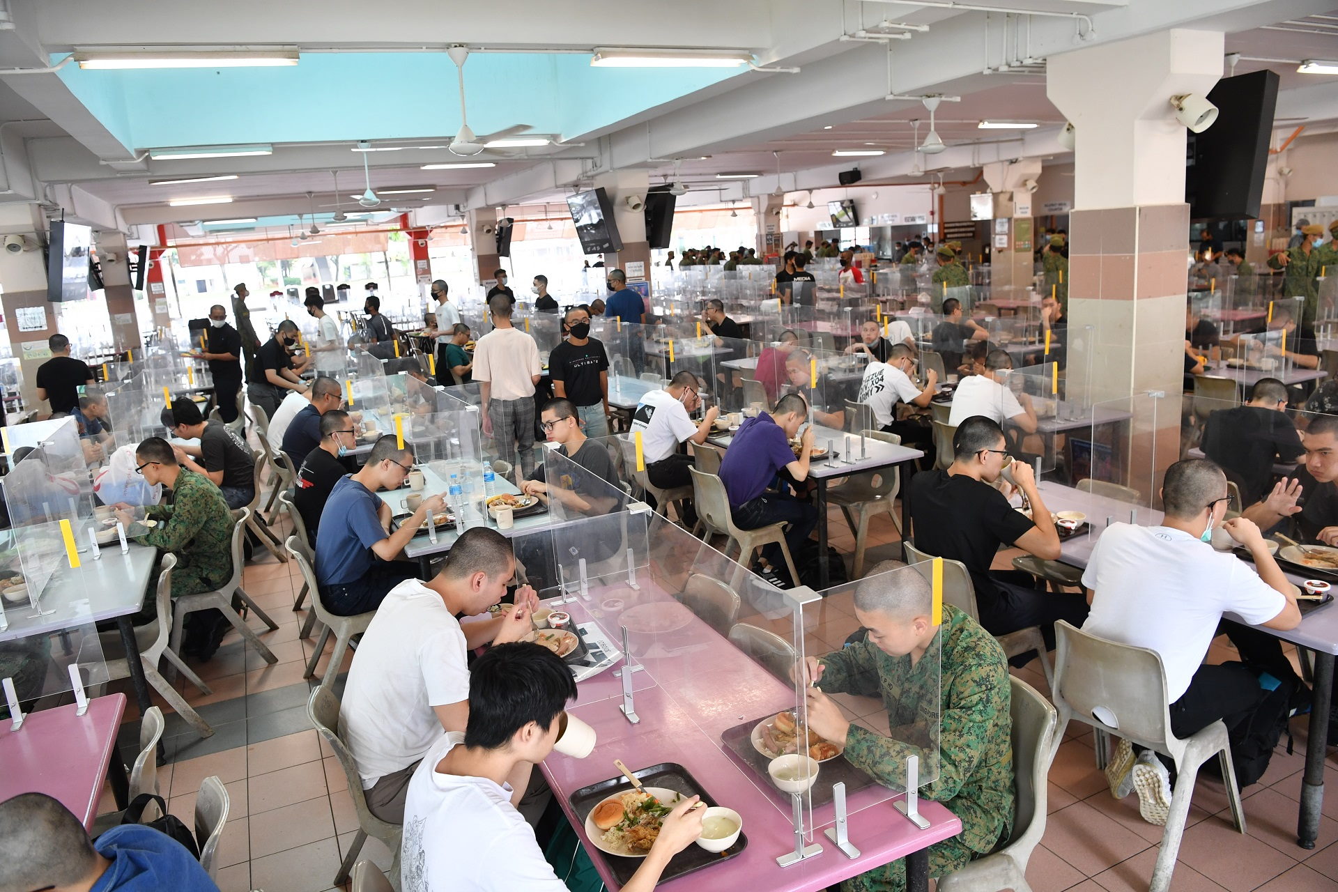 Di dewan makan, pelindung telah diletakkan di meja untuk meminimumkan kemungkinan penularan virus. Para rekrut juga diwajibkan membasuh tangan mereka sebelum dan selepas makan.