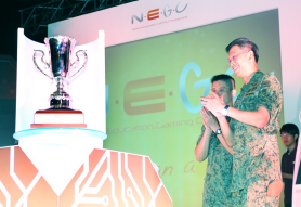 LG Neo (right) unveiling the NEGC Challenge Trophy, which the winning team will take home after the grand finals on 10 Jun.