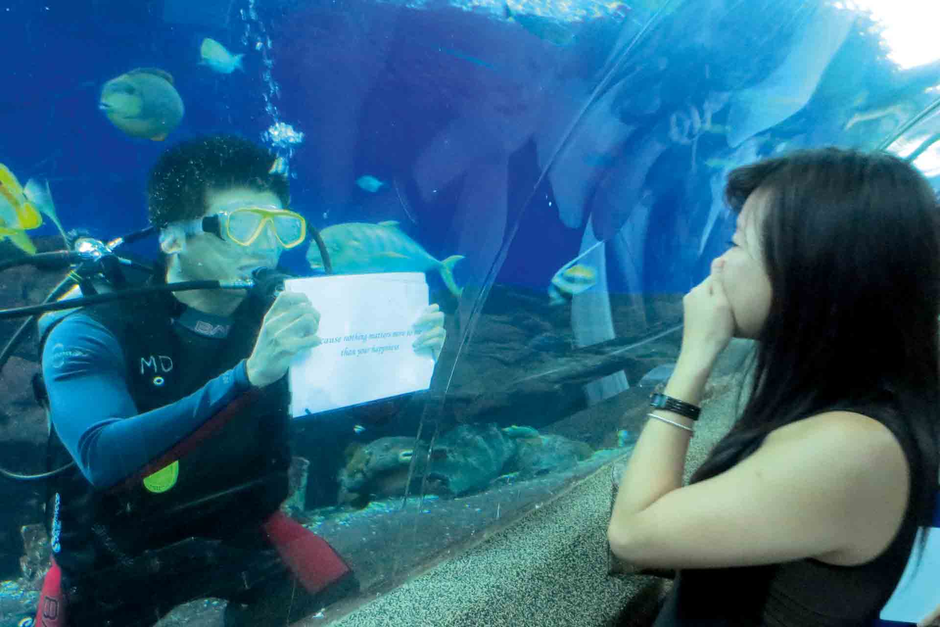 They were both on separate ships then and MAJ Kok had requested her superior to give her some time off. A colleague drove MAJ Tan home, where she found a dress with instructions for her to wear it. She then embarked on a treasure hunt with her close friends in Sentosa before entering the now-defunct Underwater World where MAJ Kok proposed using placards from inside the tank.