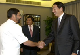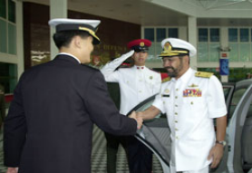 Chief of Navy, Rear-Admiral (RADM) Ronnie Tay, extending a warm welcome to his Malaysian counterpart, ADM Datuk Ilyas bin Hj Din, at the Ministry of Defence on 28 Jul (right). |