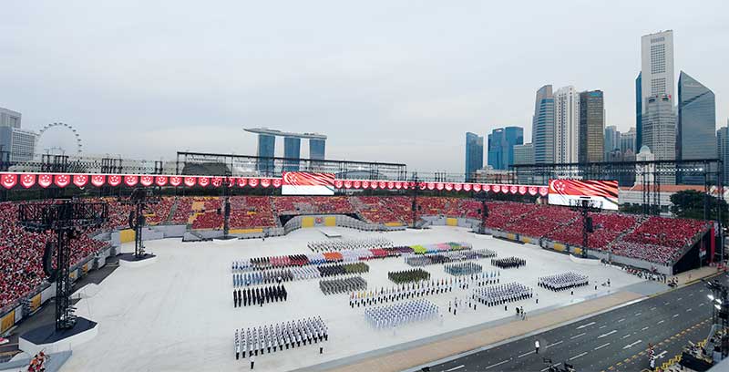 The Integrated Show culminates in a grand finale where all the performers come together in a visual spectacle. Led by a group of Singaporeans born on 9 Aug, everyone will recite the National Pledge and sing the National Anthem at precisely 8:15pm, as 1,200 performers form a mosaic of the National Flag. The Parade ends with a bang: the largest ever fireworks display at an NDP, befitting a golden jubilee parade.