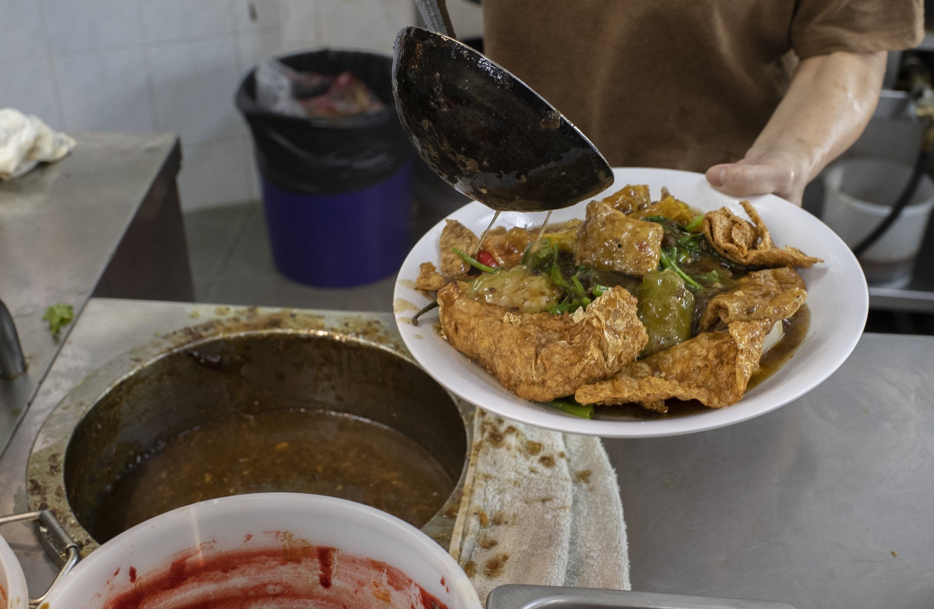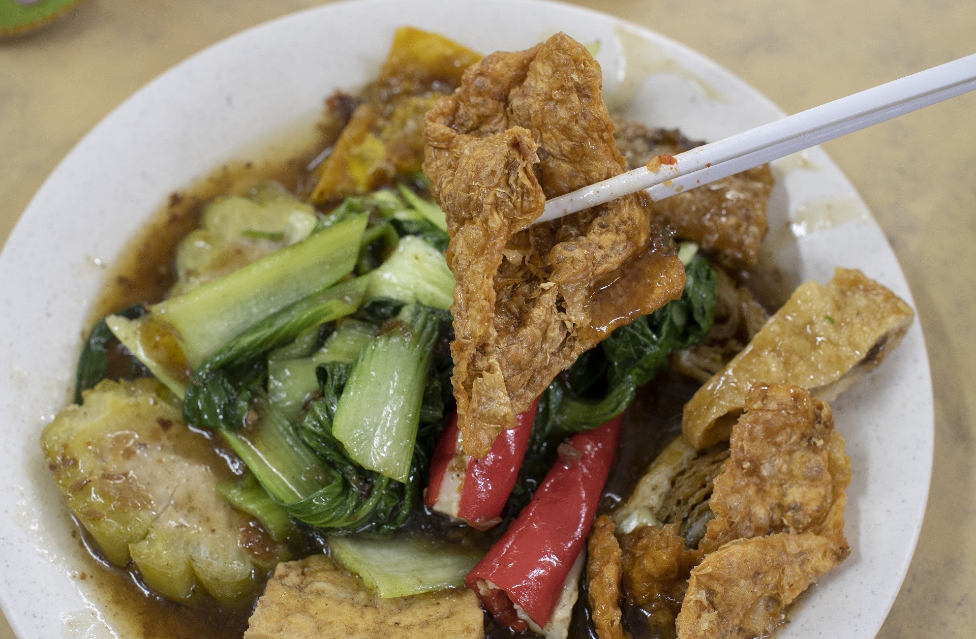 Apa yang menarik perhatian kami ialah opsyen yong tau foo (tauhu sumbat) yang begitu luas – daripada tau kee goreng (kulit tauhu) dan tau pok kepada opsyen yang lebih sihat daripada peria sumbat, bendi dan bebola ikan kukus.