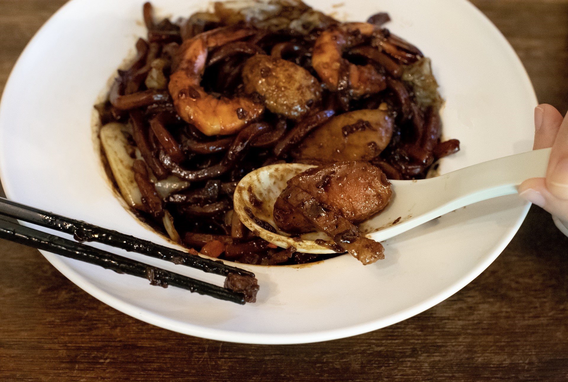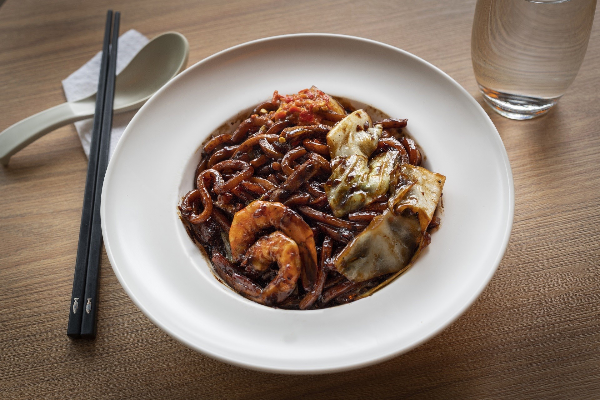 Setiap helai mi pekat disalut dengan sos hitam manis. Hidangan yang berharga $8.90, mengandungi dua ekor udang, beberapa kepingan kek ikan dan kepingan daging babi yang dihiris nipis.