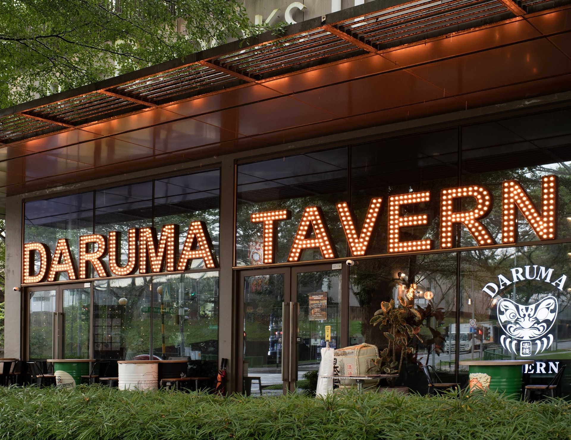 Anda tidak akan terlepas pandang gerai ini – perkataan "Tavern Daruma" adalah besar dan terang-benderang dalam lampu oren neon.