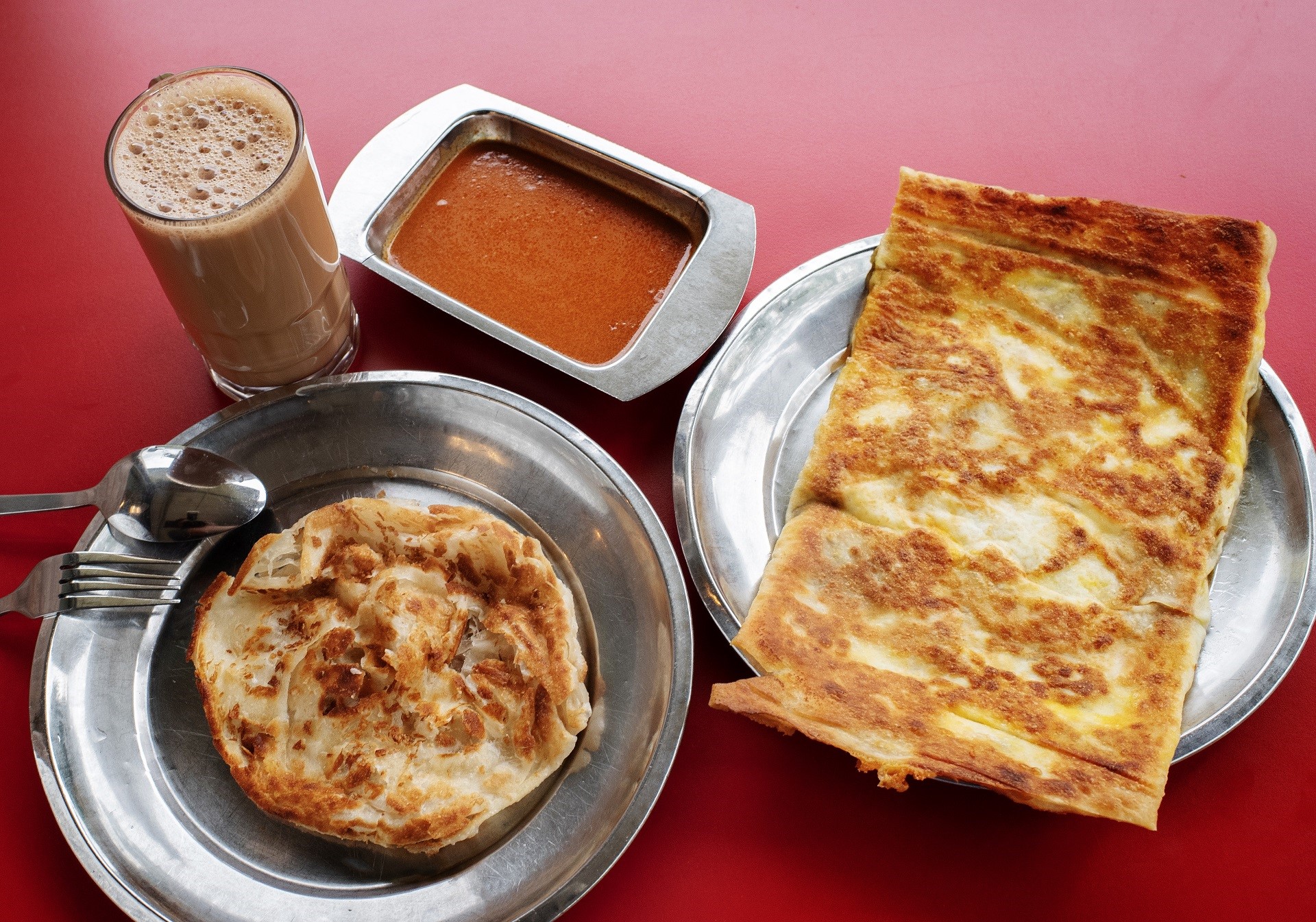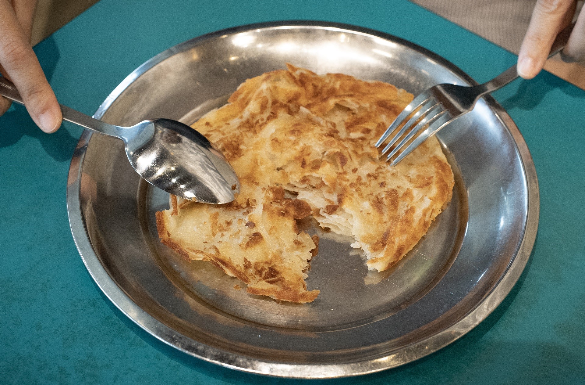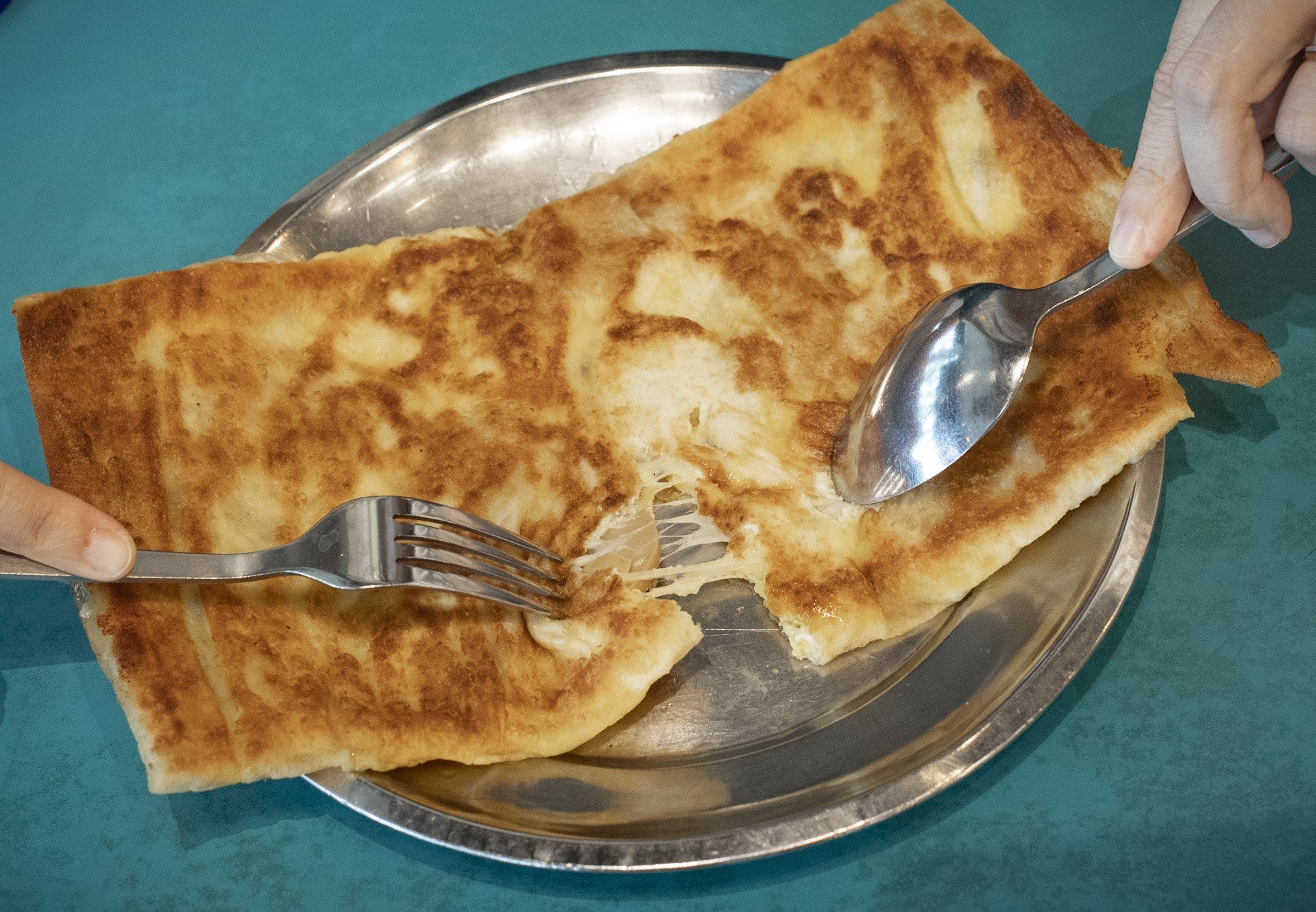 Shiok (singlish untuk gembira), bunyi menggersak boleh didengar pada saat garpu saya mencarik prata. Saya mencariknya dan gembira melihat tarikan keju.