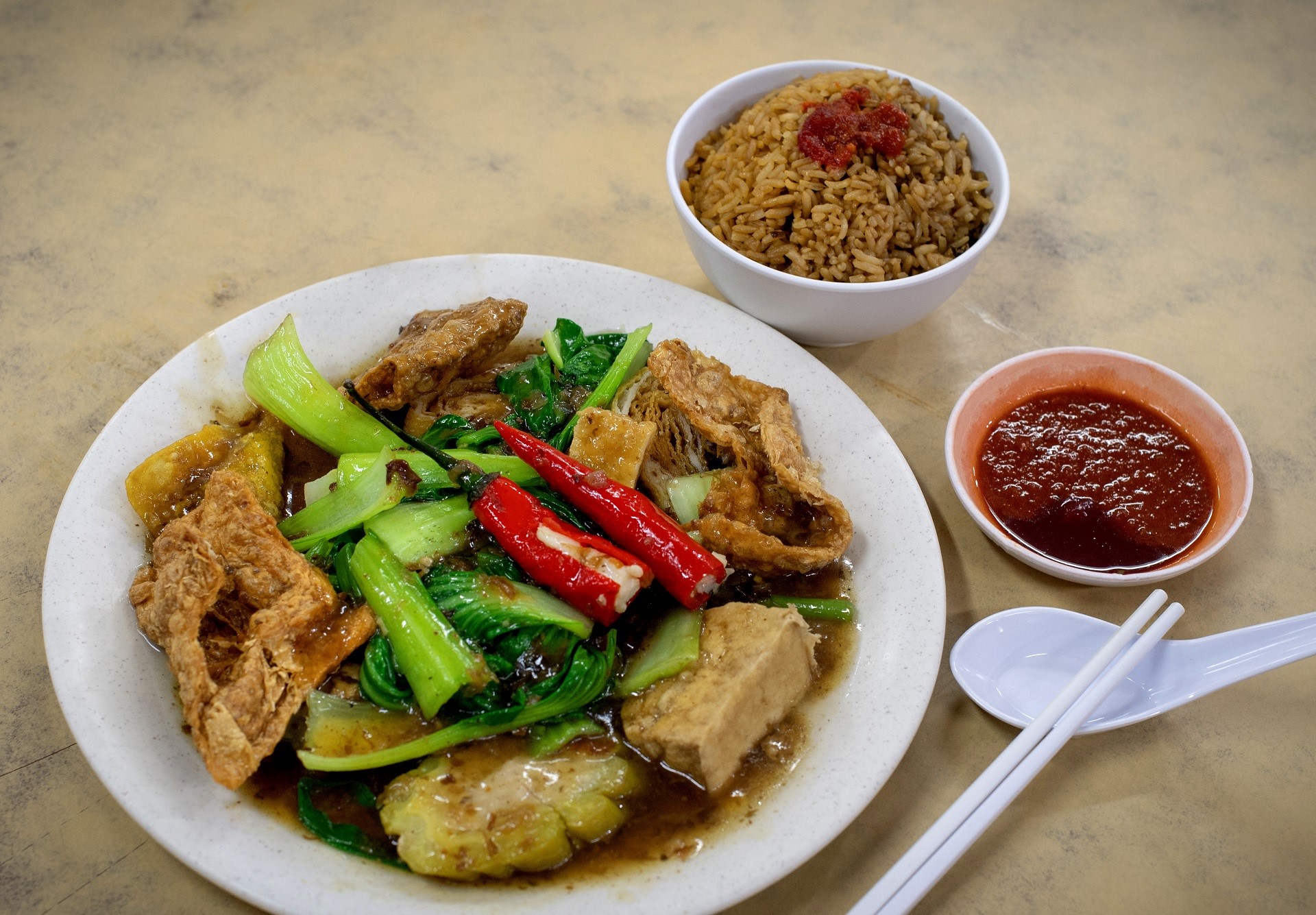 Pada harga $6, hidangan yang mengandungi sembilan bahan termasuk peria, bendi, terung, bebola ikan, ladu goreng, tauhu, tau pok, tau kee goreng dan sayur-sayuran. Satu set untuk dua orang berharga $13 – ia mempunyai dua kali ganda segala-galanya seperti di atas, dengan tambahan dua telur puyuh.