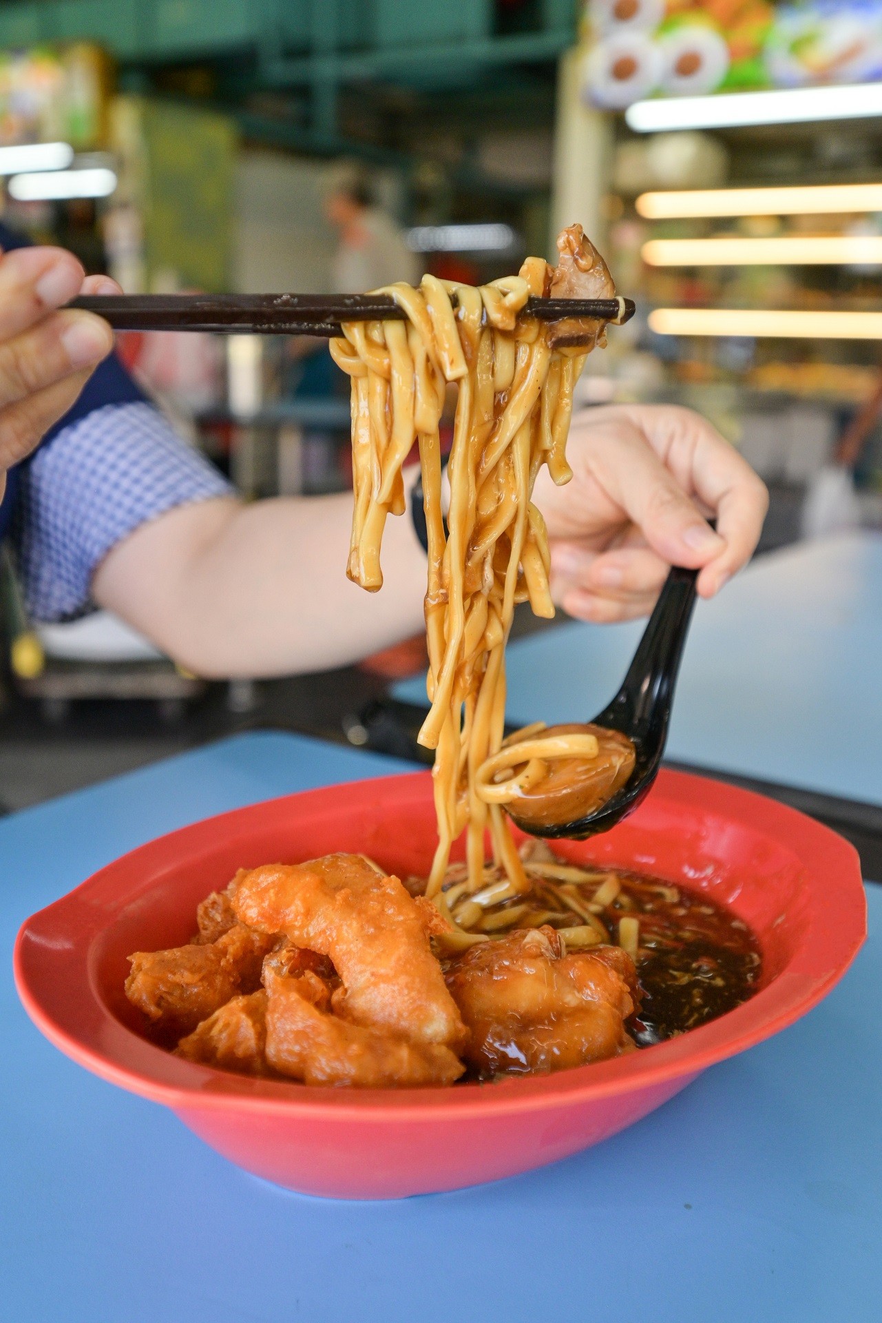 Kami makan lor mi dan tambah ikan goreng sebanyak satu dolar. Percayalah, anda tidak akan menyesal dengan tambahan itu – ketulan besar dan keemasan itu adalah bahan paling lazat dalam hidangan itu.