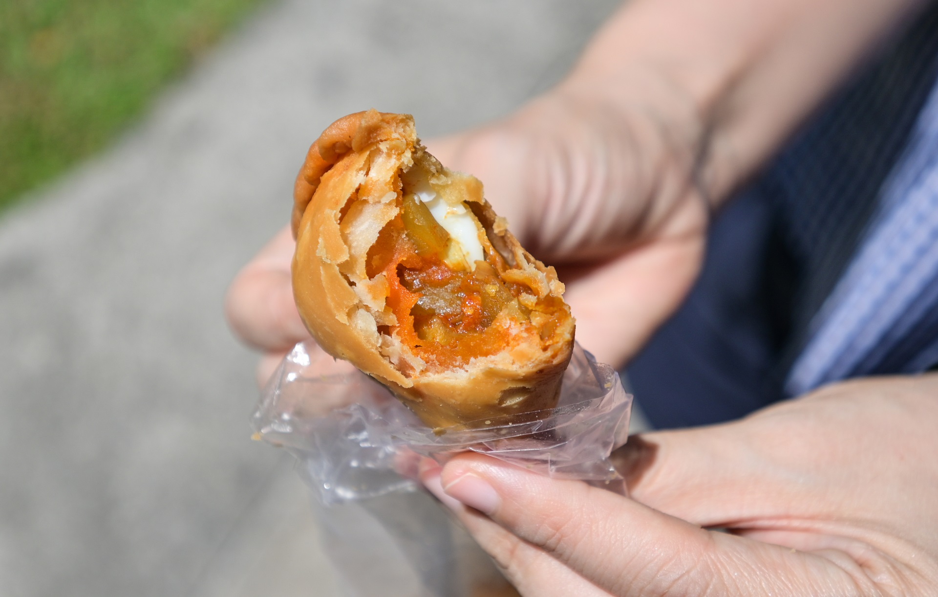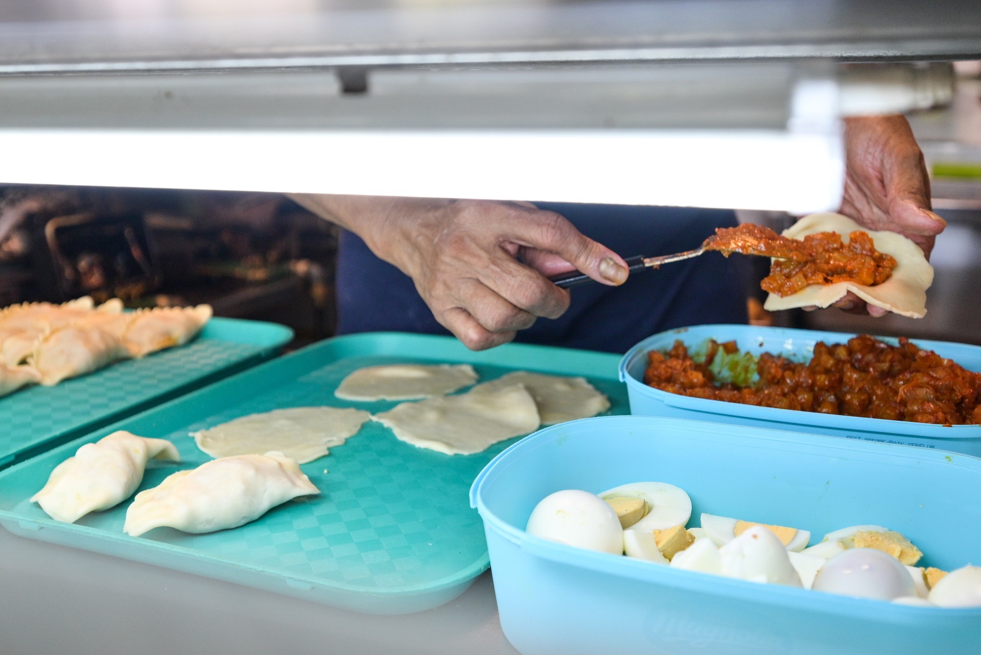 Sungguh menarik melihat aksinya - dia menari mengikut rentak alunan muzik yang berdendang di belakang sambil membubuh sesudu kentang kari merah dan sesuku potongan telur rebus ke dalam pastri putih. Kemudian, dia melipat pastri menjadi dua dan menutup intinya dengan lipatan karipapnya yang terkenal.