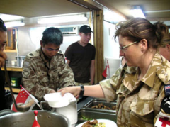 CPT Quek (left) helping out at the farewell dinner during the team's last week in Afghanistan. The meal was the culmination of the CET's friendly interaction with the NZDF.