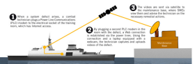 By tapping into the power lines to extend Local Area Network coverage to different parts of the ship, and using a laptop and webcam, SMEs in the maintenance base are able to look at the defects and advise technicians on board accordingly.